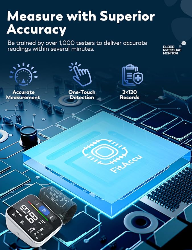 • ใ€๐‡๐ข๐ ๐ก ๐€๐œ๐œ๐ฎ๐ซ๐š๐œ๐ฒ ๐๐ & ๐‡๐‘ ๐Œ๐จ๐ง๐ข๐ญ๐จ๐ซ๐ข๐ง๐ ใ€‘ Built-in with our latest FitAccu chip and advanced AI algorithms that have been trained by over 1,000 testers, this blood pressure monitor detects your blood pressure with superior high accuracy. While measuring the blood pressure, it also detects your heart rate and will alert you if there is any irregular heartbeat detected.